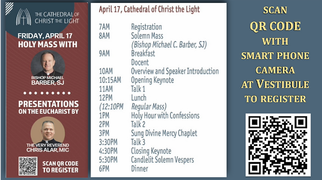 Fr. Chris Alar, a well-known speaker from the Marians of the Immaculate Conception fathers who are the primary disseminators of The Divine Mercy Mercy message and devotion in the United States will be at Christ the Light Cathedral on Friday, April 17. You must register to attend. Use the QR code or ask Rose at 510.222.5558. The Divine Mercy message from Our Lord is important for us all to hear before His divine judgement comes. Due to this event, the 3rd Friday, 3pm Great Hour of Mercy Adoration hosted by Divine Mercy will be at Christ the Light next Friday.